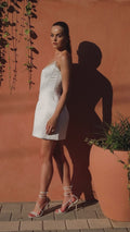Vestido de novia clásico de corte A, minivestido de novia blanco de satén con encaje, manga larga, flores 3D, sexy, sin espalda, con botones y sin tirantes