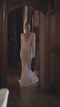Vestido de novia sexy transparente con escote en V profundo y brillante, con apliques de encaje y largo hasta el suelo