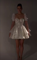 Robe de mariée courte à paillettes et perles, manches bouffantes, princesse, décolleté en cœur, robe de soirée, robe élégante pour femme, luxe