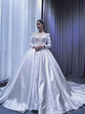 Robe de mariée en satin mat à manches longues et col en cœur, robe de mariée élégante en dentelle et perles