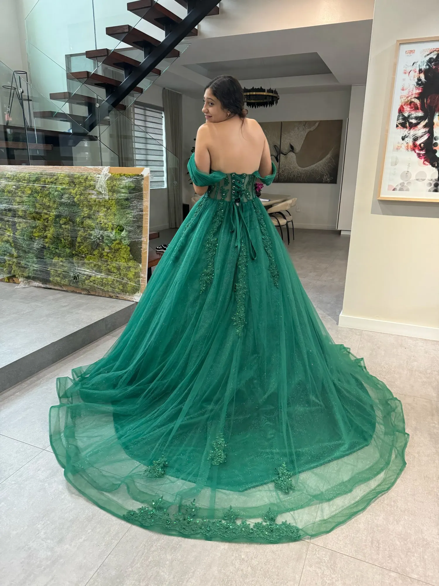 Abiti da Quinceanera di lusso con cristalli scintillanti verdi, con spalle scoperte, per feste di compleanno, abiti da ballo, abiti da 15 anni
