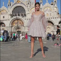 Principessa Corto Paillettes Maniche a sbuffo Tulle Abito da Sera Spaghetti Spalline Scollo a V A-Line Schiena Scoperta Lacci Sexy Abito da Ballo