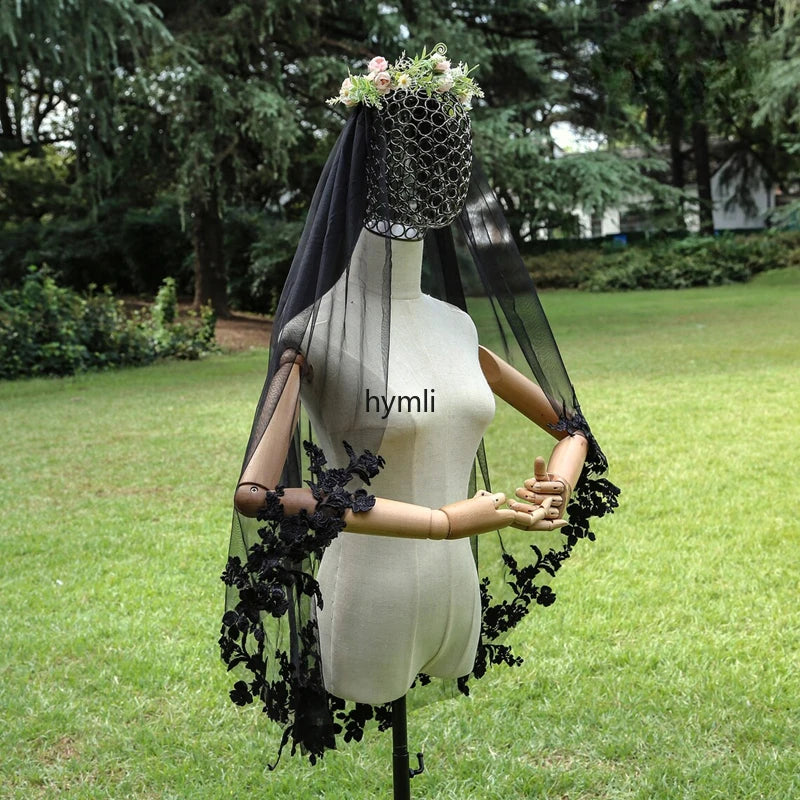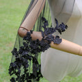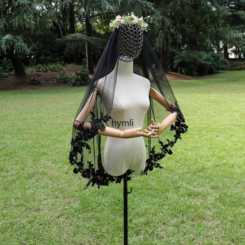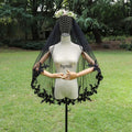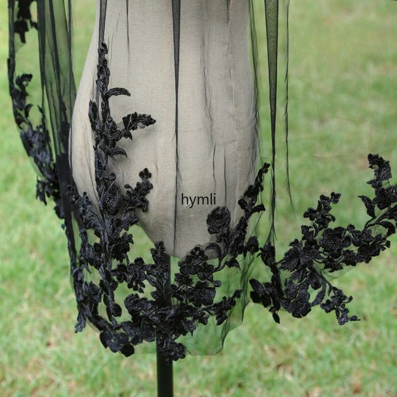 1 Layer Bridal Veil with Black Lace Applique Wedding Dress Fingertip Black Wedding Veil
