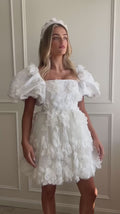 3D Bloemen Vierkante Hals Pofmouwen Korte Bruiloftsfeestjurk A-lijn Ritssluiting Achterkant Mini Lengte Bruidsjurk