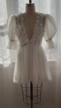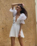 Korte trouwjurken Diepe V-hals Halve mouwen Parels Bloemen Mini-bruidsjurken Sexy Rugloze Illusie Formele trouwjurken