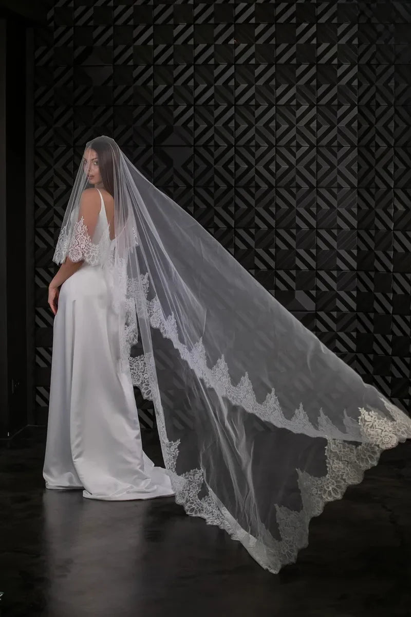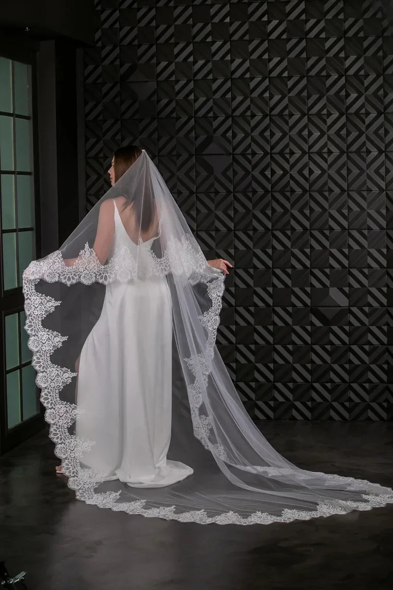 Chapel / Cathedral Wedding Veil Lace Trim Bridal Veil 2 Tires Tulle Long Veil Metal Comb