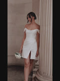 Off Shoulder High Side Slit Short Wedding Dress Flowers Sheath Zipper Back Above Knee Mini Bridal Gown