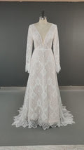 Long Sleeves Floral Lace V Neck Boho Wedding Dress Deep V Neck Open Back Modest Rustic Civil Bridal Gown