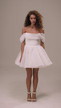 Spectacular off-the-shoulder mini dress cut from flowy organza. Featuring a boned heart-shaped corset with a lace-up closure on the back, and a cute flaring mini skirt.